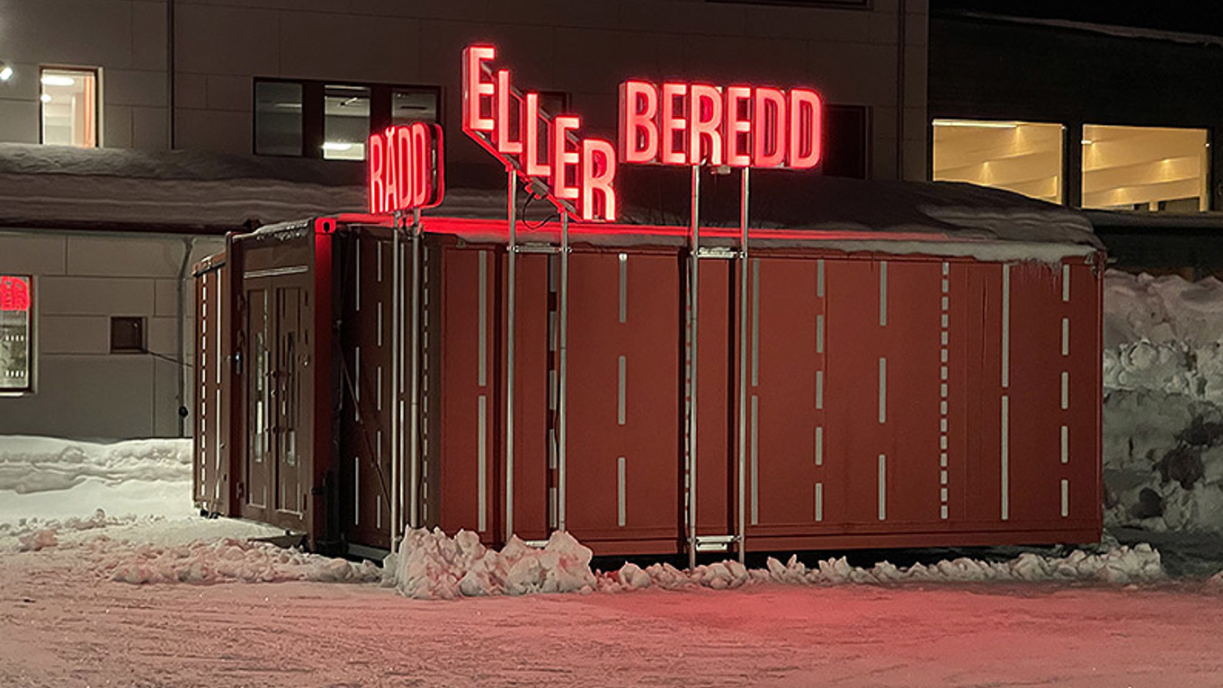 Vid Maja Beskowgymnasiet står utställningen i en ombyggd container på 40 kvadratmeter. Den är välkomnande med varma röda väggar och punktbelysning. Där finns fyra stationer som ungdomarna går runt till, de lyssnar och är med, de ska svara på frågor som ställs. Samtidigt, i ett klassrum inne på gymnasiet pågår en lektion om krisberedskap och om det totalförsvar vi har i Sverige. Där lärs grunderna ut, både här ochi utställningenbygger informationen på broschyren Om krisen eller kriget kommer som MSB skickade till alla hushåll i Sverige 2018.