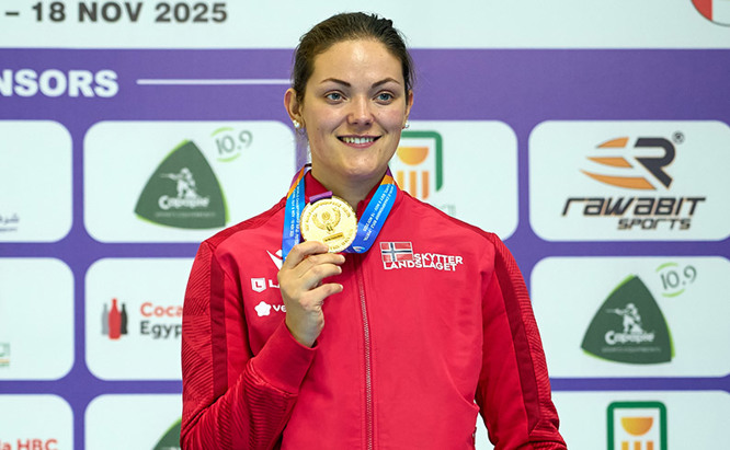 Jeanette Hegg Duestad poserar med sitt VM-guld från Kairo 2025 (50m 3x20). I januari står hon på startlinjen i Swedish Cup.