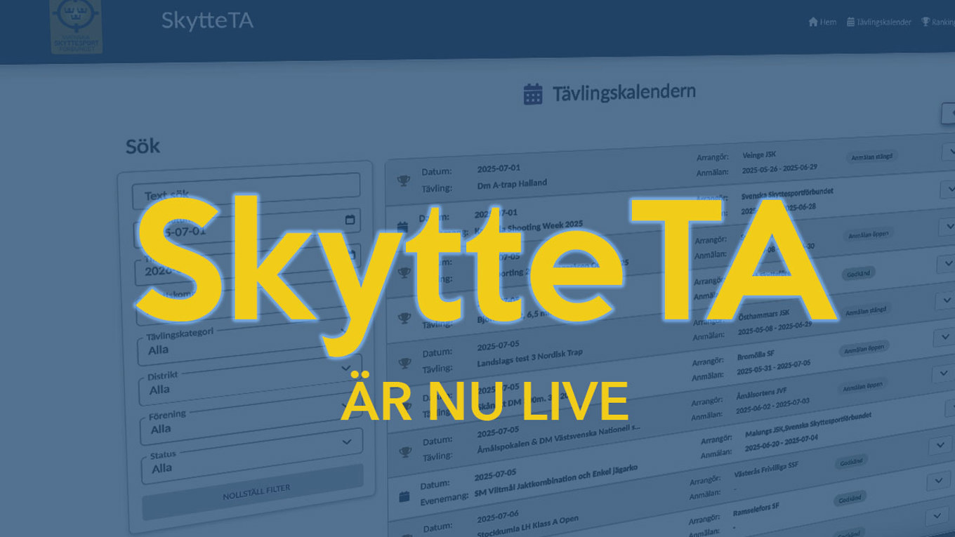 Idag lanseras den nya tävlingskalendern i SkytteTA, ett modernt och användarvänligt system som gör det enkelt och smidigt att administrera skyttetävlingar. SkytteTA är utvecklat med våra medlemmar i fokus för att skapa en enklare tävlingsupplevelse. Från och med nu sker all tävlingsadministration via SkytteTA. Det tidigare systemet IndTA finns kvar en tid för att du ska kunna se historik.