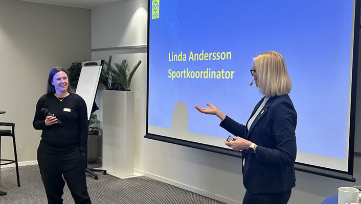 Generalsekreterare Ulrika Back presenterar Linda Andersson och den nya rollen som sportkoordinator under förbundsmöteshelgen.